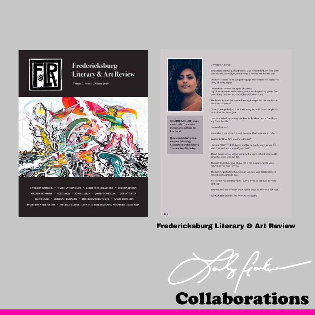 Since that day, Ghadir has not looked back. Her accomplishments include, but are not limited to: 1 million loyal viewers (luvaholics are their names), performed spoken word poetry at numerous open mics/social justice events, at a celebrity chef’s book tour event, at a healthcare awareness event, at a memorial in the DMV area/Brooklyn (NY), is a co-host of the Awkward Minority Podcast, a member of the Talkinish podcast, put together a segment for a fashion show that was held at the University of Louisville, the Director of Marketing for Sanquon.com, collaborated with other artists where two of her poems were translated into two beautiful paintings, was featured in a mixtape, two of her poems have been published, she has hosted her own event in March of 2019, has collaborated with loveseamoss.com/shopluxeskincare.com by customizing two different body butters to reflect her poetry, has collaborated with etsy.com/shop/bearycandles by customizing two different candles to also reflect her poetry, she has many more projects coming soon.