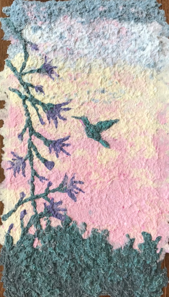 Jennifer’s pulp paintings have been shown regionally, nationally, and internationally, and have won several awards in National Juried Exhibitions. She is a member of IAPMA (International Association of Hand Papermakers and Paper Artists), NAHP (North American Hand Papermakers), FCCA (Fredericksburg Center for the Creative Arts), and her work is shown locally at Alleghany Highlands Arts and Crafts Center in Clifton, Forge.